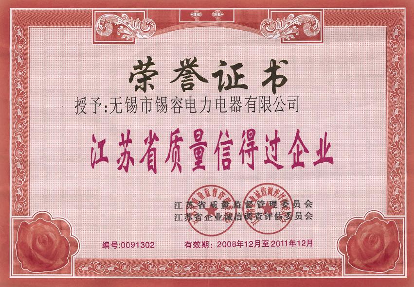 2008年江蘇省質(zhì)量監(jiān)督管理委員會、江蘇省企業(yè)誠信調(diào)查評估委員會,授予無錫市錫容電力電器有限公司 “江蘇省信得過企業(yè)”榮譽證書