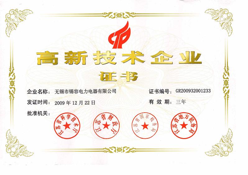 2009年12.22日,無錫市錫容電力電器有限公司獲取高新技術(shù)企業(yè)證書,批準(zhǔn)機關(guān):江蘇省科學(xué)技術(shù)廳、江蘇省財政廳、江蘇省國家稅務(wù)局,江蘇省國家稅務(wù)局